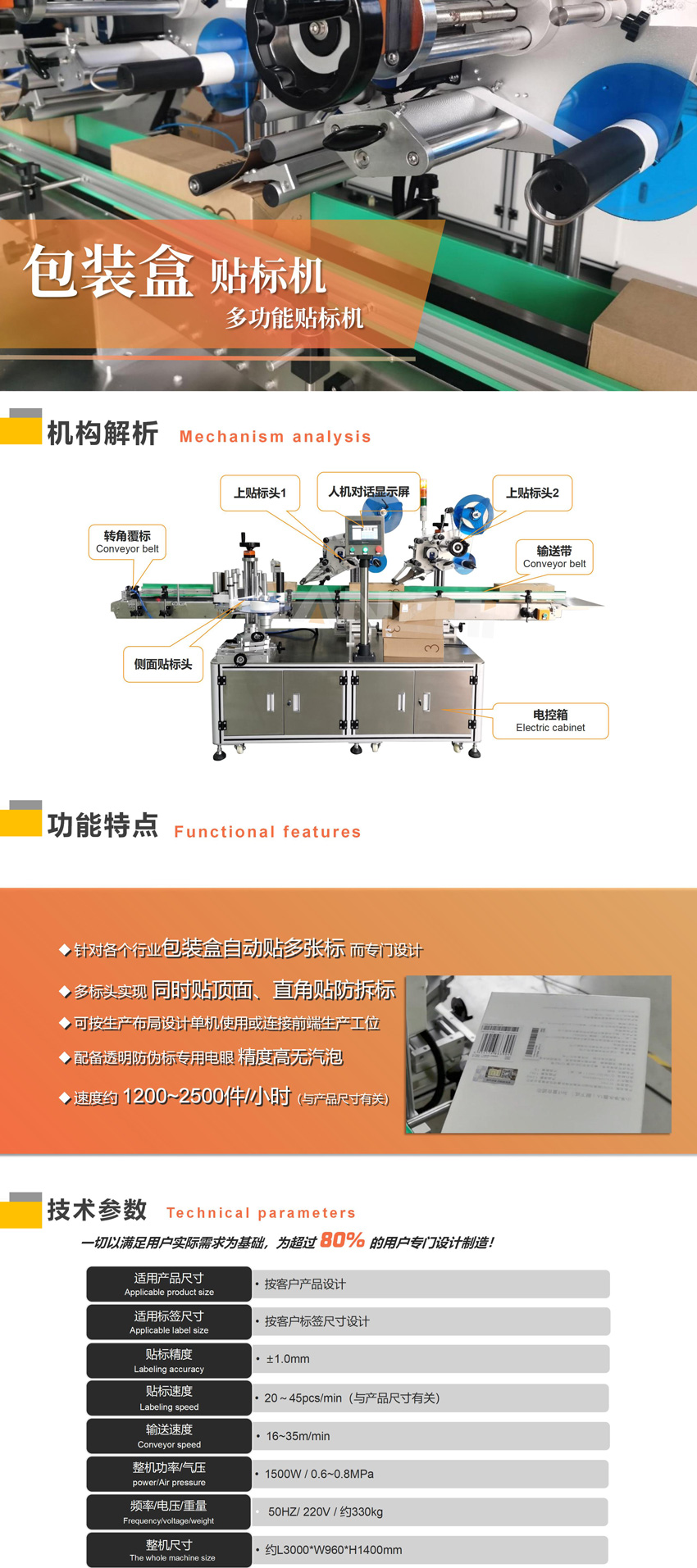 適用于在各種包裝盒的上平面+轉角+側面貼標簽或不干膠膜,實現多功能貼標一體化,本案例為濾芯器包裝盒貼標專屬訂制。