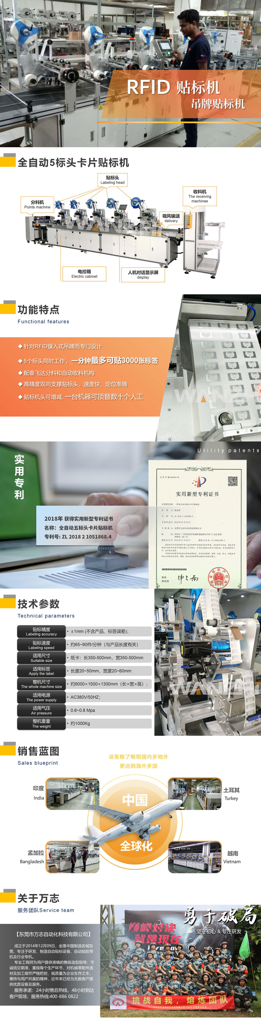 基本用途: 適用于印刷、服裝輔料行業,針對RFID鑲入式吊牌而專門設計,5個標頭同時工作,一分鐘最多可貼3000張電子標簽,一臺機器可頂替數十個人,是吊牌貼標的最新一代武器。 萬志自動化是國內一有大型貼標機廠家。專注于為客戶設計生產各類貼標機、實時打印貼標、非標機、貼雙面膠機等自動化設備,一對一專業設計服務,是行業內優質的自動貼標包裝設備制造商;免費電話:400-8860-822