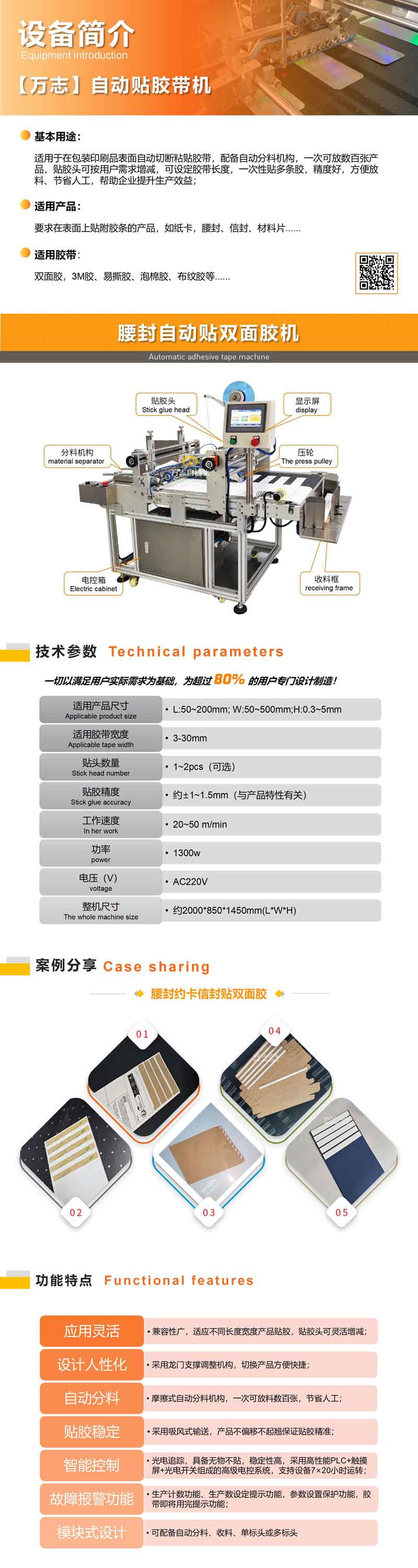 適用于在包裝印刷品表面自動切斷粘貼膠帶,配置備自動分料機構,一次可放數百張產品,貼膠頭可按用戶需求增減,可設定膠帶長度,一次性貼多條膠,精度好,方便放料、節省人工,幫助企業提升生產 益;