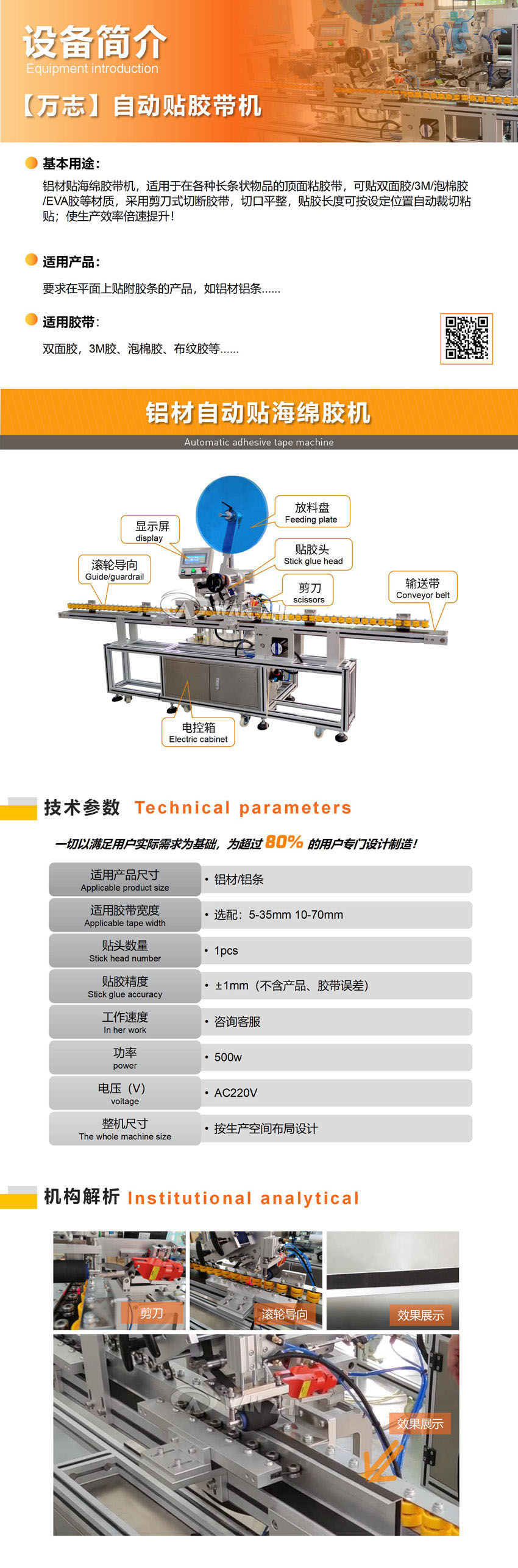 鋁材 貼海綿膠帶機適用于在各種長條狀或圓管等物品的表面或圓弧面粘膠帶,可貼雙面膠/3M/泡棉膠/EVA膠等材質(zhì),根據(jù)貼膠長度要求自動裁切粘貼;