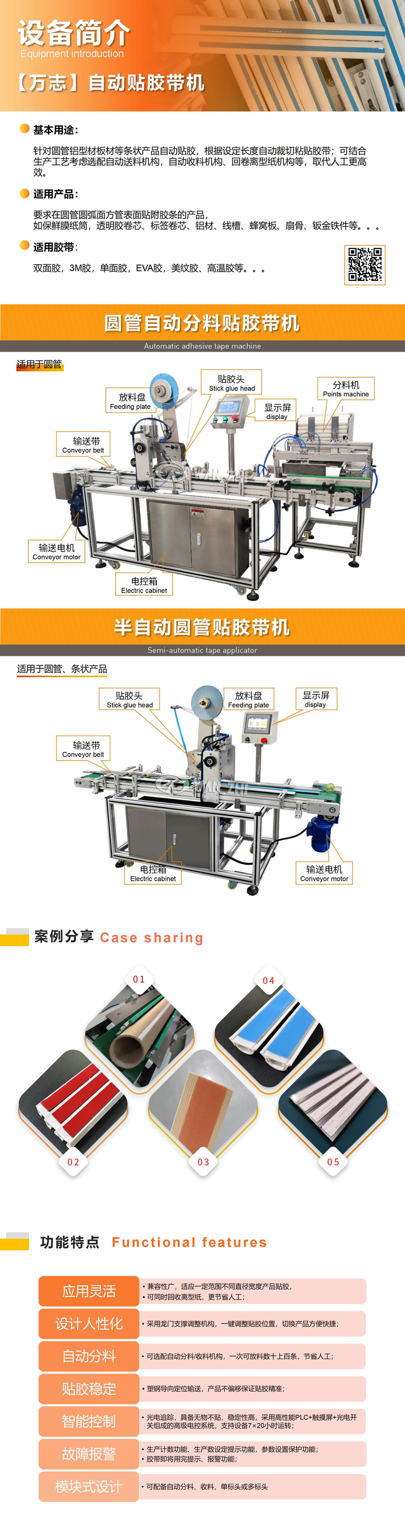 針對圓管鋁型材板材等條狀產品自動貼膠,根據設定長度自動裁切粘貼膠帶;可結合生產工藝考慮選配自動送料機構,自動收料機構、回卷離型紙機構等,取代人工更高效。