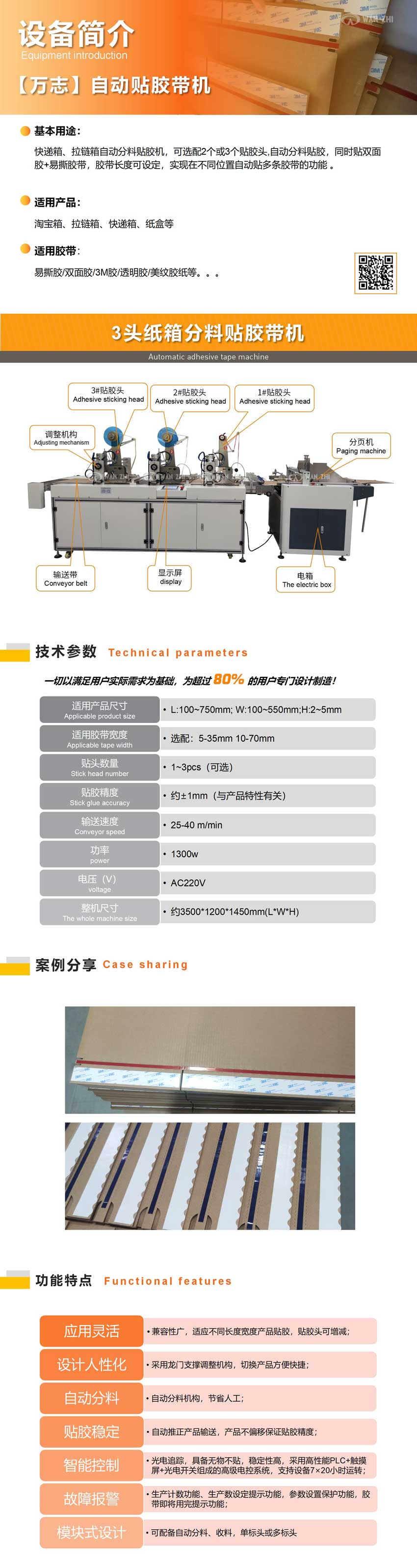 快遞箱、拉鏈箱自動分料貼膠機(jī),可選配2個(gè)或3個(gè)貼膠頭,自動分料貼膠,同時(shí)貼雙面膠+易撕膠帶,膠帶長度可設(shè)定,實(shí)現(xiàn)在不同位置自動貼多條膠帶的功能 。