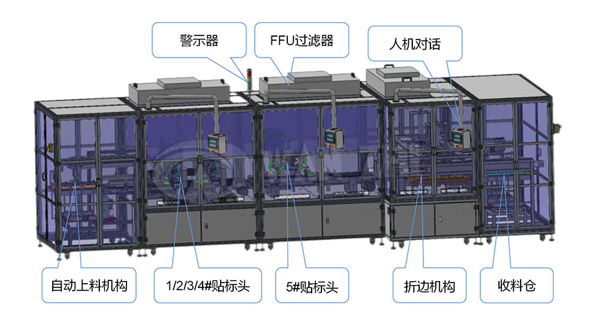 現(xiàn)場布局簡單,產(chǎn)品切換方便。整線包含自動(dòng)上料機(jī)、貼標(biāo)機(jī)、搬運(yùn)模組、壓合折邊機(jī)、收料機(jī)。
