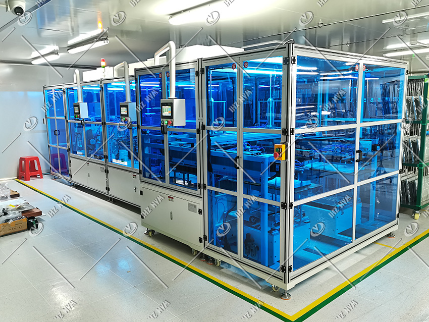 LED反射片貼標(biāo)及壓合折邊機(jī)投放于無塵車間使用,設(shè)備采用ffu過濾設(shè)備,使外氣先通過MAU(外氣進(jìn)行首次過濾)進(jìn)入無塵室頂部,再通過FFU(二次過濾)將風(fēng)送進(jìn)無塵室內(nèi),送下來的風(fēng)通過高架地板,再進(jìn)入回風(fēng)箱送到無塵室頂部, 風(fēng)速調(diào)節(jié)靈活,潔凈區(qū)易于變更;