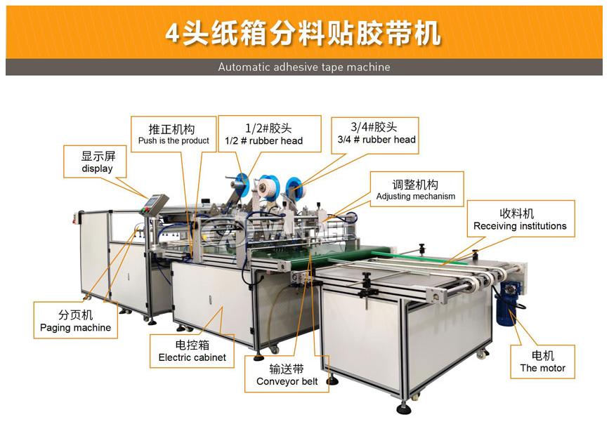 可配置2-4個貼膠頭,實現輸送方向同時貼2條膠帶,貼合長度可任意設定;貼膠頭可根據用戶需求選配;設備可選自動分料/收料機構,工作效率約50-90m/min(效率與產品尺寸有關);